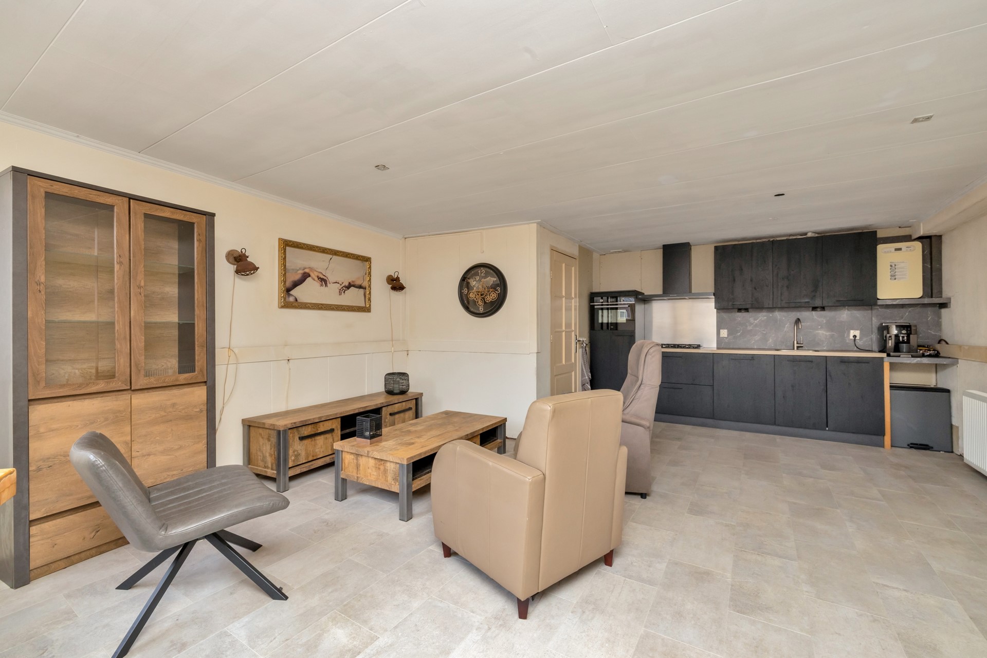 Entree met toegang tot de woonkamer. De woonkamer vormt het hart van de woning en biedt een fijne basis voor een sfeervolle leefruimte. Aansluitend bevindt zich de vernieuwde, open keuken met koelkast, gaskookplaat en afzuigkap. Ook de badkamer met douche, toilet en wasmachineaansluiting bevindt zich op de begane grond.